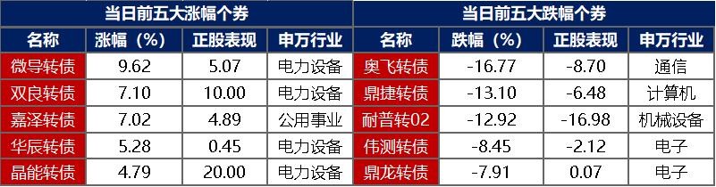 【转债市场主要指数涨跌不一】 2月4日,转债跟随权益市场窄幅震荡,中证转债、深证转债分别收跌0.04%、0.15%,上证转债收涨0.05%。转债市场成交额873.32亿元,较前一交易日缩量102.16亿元。转债市场个券涨跌各半,382支转债中,180支收涨,188支下跌,14支持平。当日上涨个券中,微导转债涨超9%,双良转债、嘉泽转债涨超7%;下跌个券中,奥飞转债跌逾16%,鼎捷转债跌逾13%。