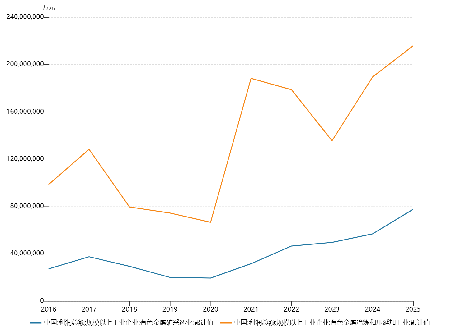 图片趋势描述:从数据趋势分析,从2020年开始有色金属行业利润迎来较强增长,随着AI算力、电网升级、新能源等新兴需求爆发,板块盈利稳定性显著增强