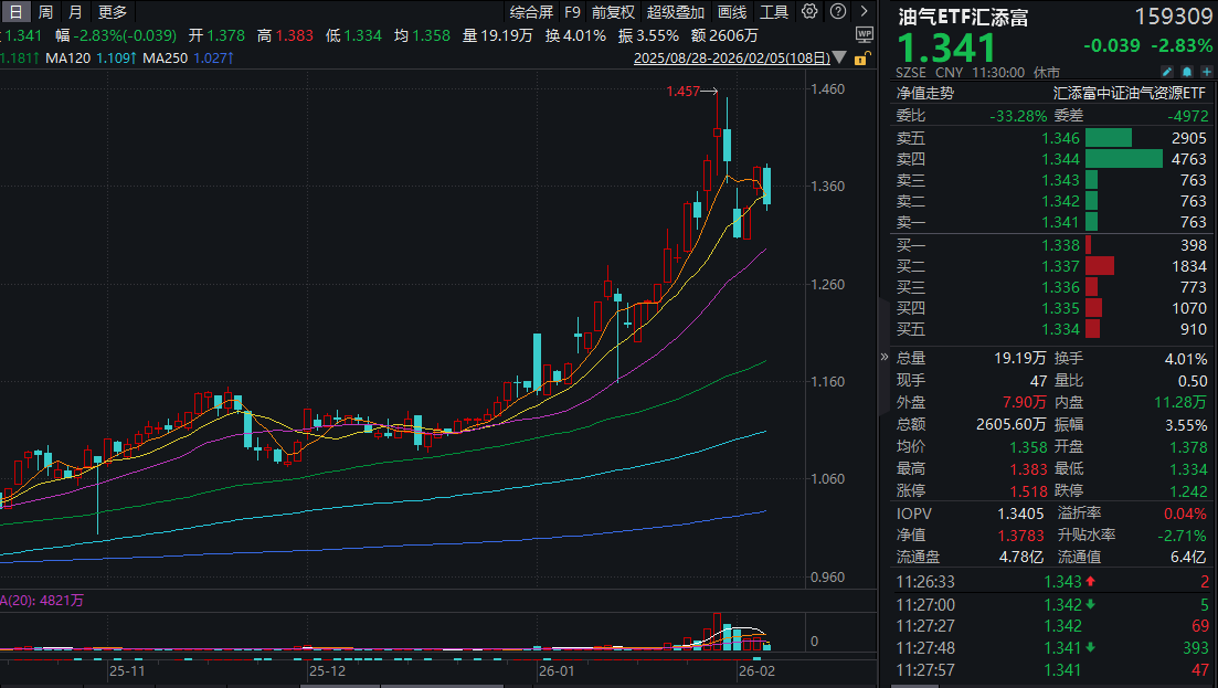 今日(2.5),市场情绪波动加剧,油气板块回调。油气ETF汇添富(159309)跌近3%,盘中成交额已超2600万元。资金持续涌入,近5日有4日获资金青睐,5日“吸金”近3亿元!