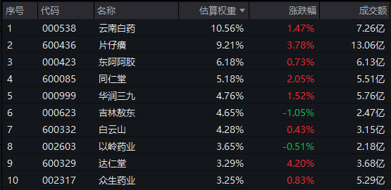 中药ETF(560080)标的指数成分股多数飘红:达仁堂涨超4%,片仔癀涨超3%,同仁堂涨超2%,云南白药、华润三九涨超1%,东阿阿胶、白云山、众生药业微涨。