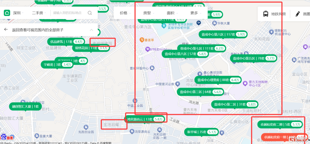 另一方面,作为福田、龙华核心区域外溢的板块,市场的实际估价水平一直都不算高,从二手房挂盘情况可以看到,金地启曜府附近的二手次新房整体水平维持在5万—6.5万/㎡。