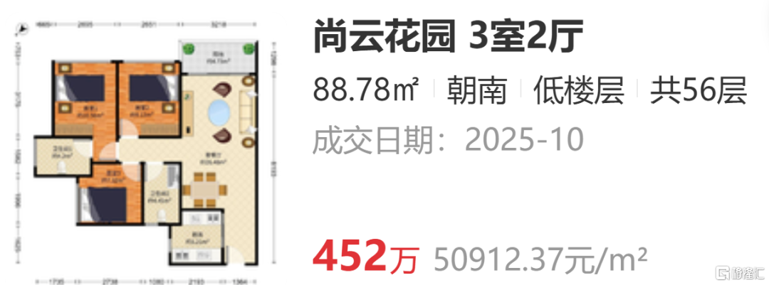 去年10月也成交一套约88.78平的三室两厅低楼层,成交总价约452万,折合单价约 5.09万/平。