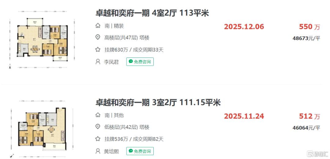 比如2022年分别两次推售的卓越和奕府,去年11月24日一期成交一套约111.15平的三室两厅低楼层,挂盘82天,挂盘报价536万,成交总价约512万,折合单价约 4.61万/平;