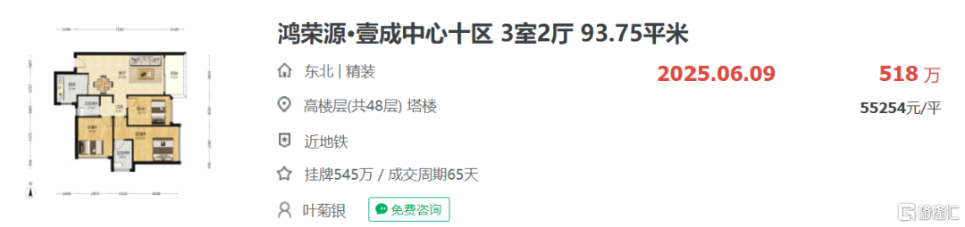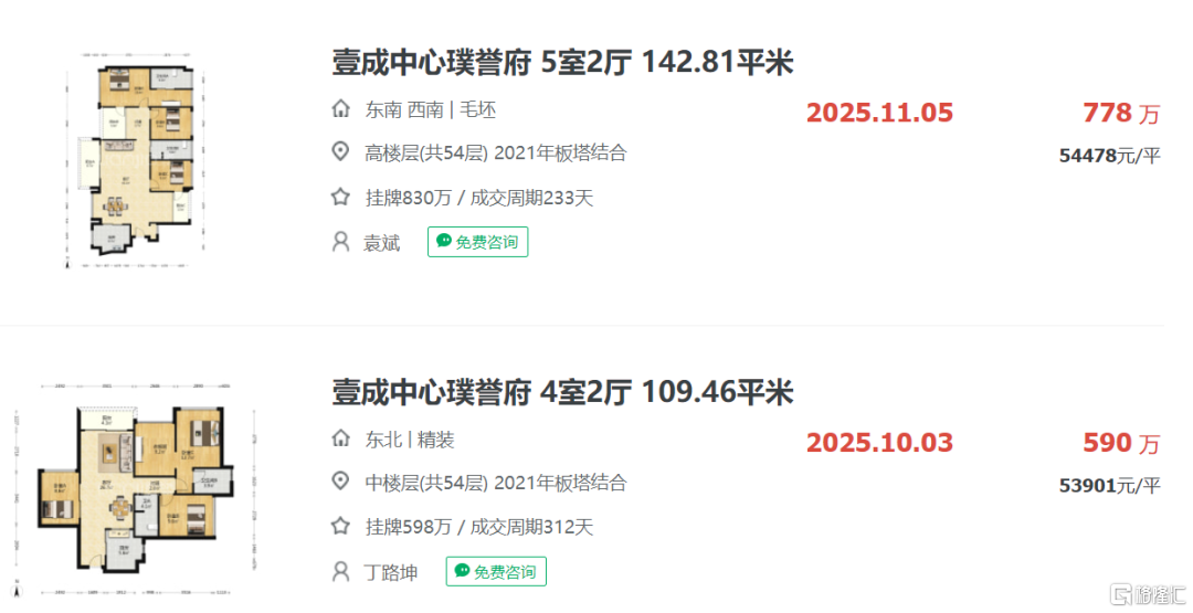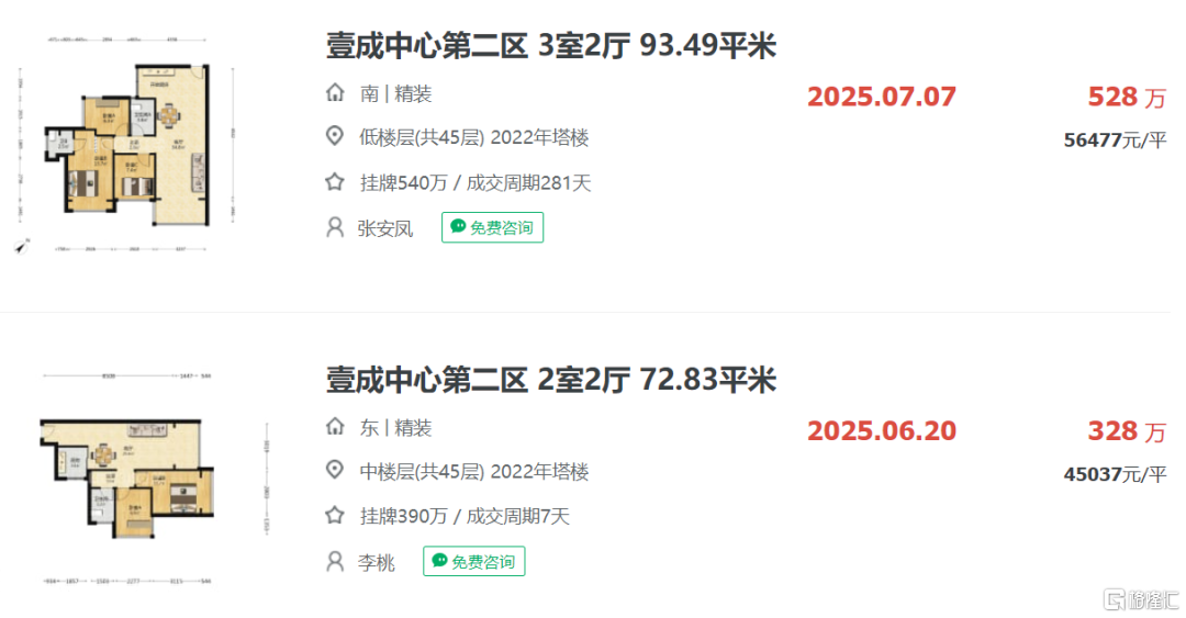 去年7月7日壹成时代花园(壹成中心第二区)成交一套约93.49平的三室两厅低楼层,挂盘281天,挂盘报价540万,成交总价约528万,折合单价约5.65万/平;去年6月20日也成交过一套约93.49平的三室两厅低楼层,挂盘7天,挂盘报价390万,成交总价约328万,折合单价约4.5万/㎡。