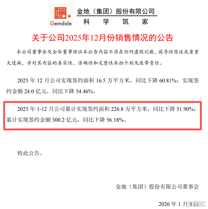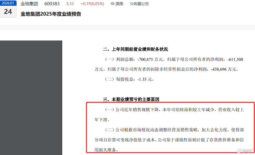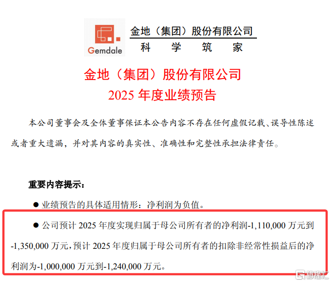 今年1月金地发布业绩公告显示,2025年归母净利润预亏超111亿—135亿元,创上市以来最大亏损,销售金额同比暴跌56.18%。