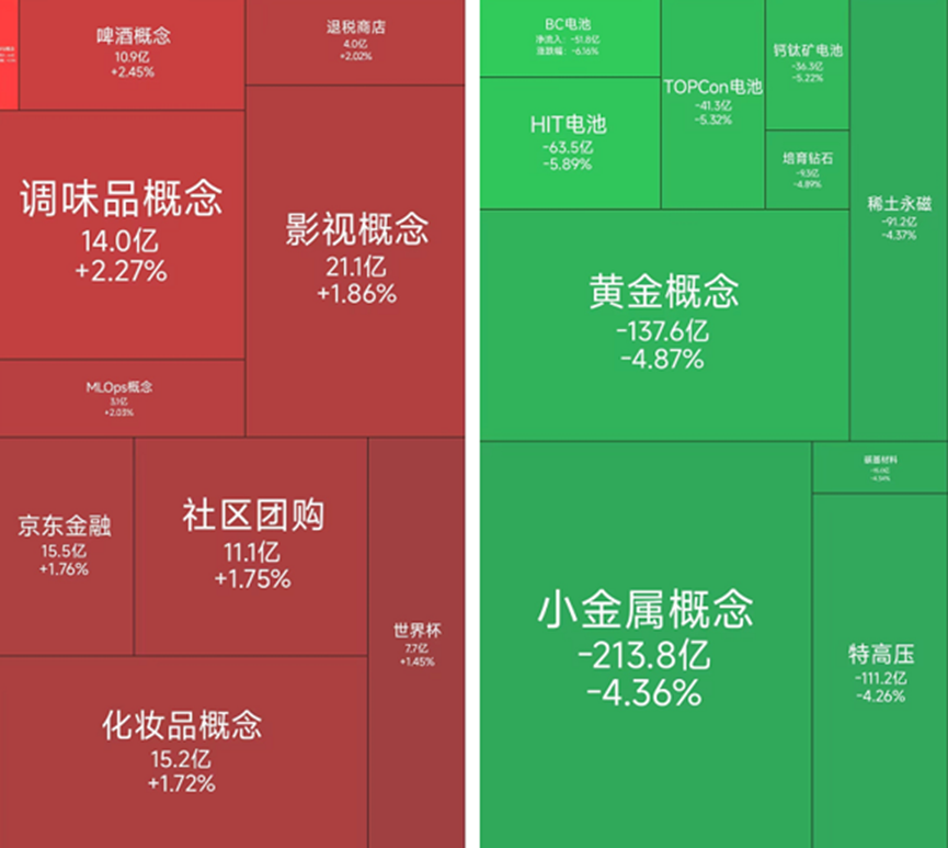 2月5日,A股三大指数集体下跌。截至收盘,沪指跌0.64%,报4075.92点,深成指跌1.44%,报13952.71点,创业板指跌1.55%,报3260.28点。从板块行情上来看,今日表现较好的是调味品概念、影视概念和社区团购,而黄金概念、HIT电池和小金属概念等板块下跌。