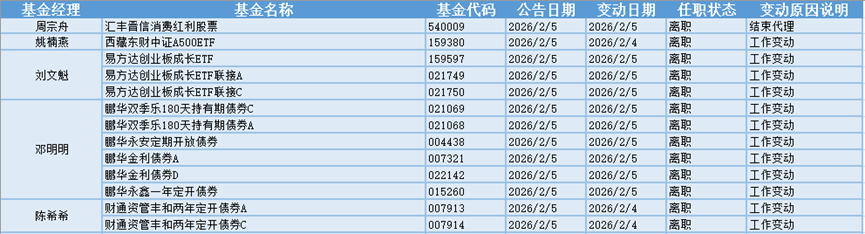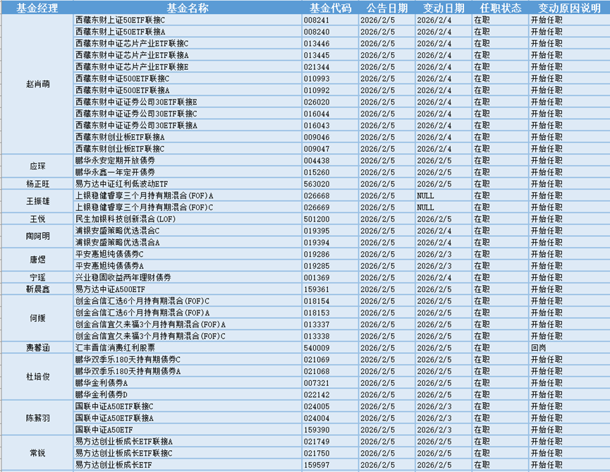 基金经理是一只基金产品最核心的成员,能决定一只基金的投资方向、投资策略以及投资风格,基金经理出色的择时选股能力和调研预测能力是基金业绩的有力保证,所以基金经理是投资者在选择基金产品时的重要依据。基金经理的变动很大程度上会影响到基金产品未来的表现,是一个需要特别关注的信息。2月5日共有19位基金经理发生任职变动。