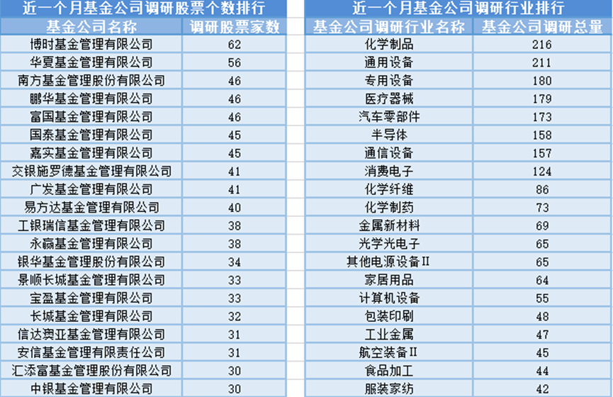 近一个月(1月6日-2月5日),博时基金参与公司调研的数量最多,共调研62家上市公司,此外调研较为活跃的还有华夏基金、南方基金和鹏华基金,分别调研56家、46家、46家上市公司;从调研行业上来看,基金公司对化学制品行业的上市公司调研次数最多,共有216次,其次是通用设备行业,基金公司调研了211次。