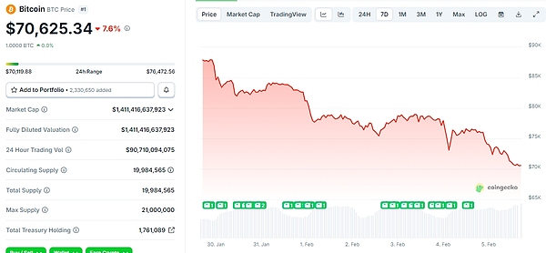 截至发稿,BTC报70625.34美元,24小时跌幅7.6%;ETH报2091.91美元,24小时跌幅7.9%;BNB报690.47美元,24小时跌幅9.5%;XRP报1.43美元,24小时跌幅10.6%;SOL报90.64美元,24小时跌幅6.9%。