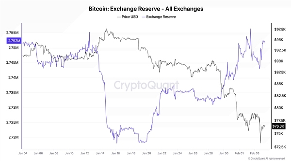 分析师Axel Adler Jr.指出,自1月19日以来,交易所储备已从271.8万枚比特币增至275.2万枚比特币。该分析师警告称,如果储备持续增长并超过276万枚比特币,可能会加剧抛售压力。他还表示,市场尚未出现全面崩溃,这种情况可能会在更低的价格水平发生。