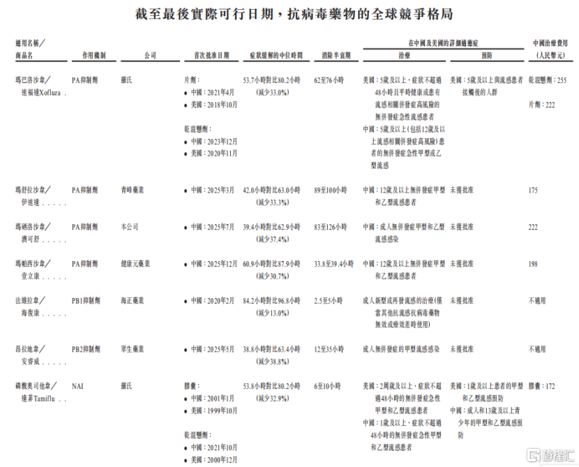 NAI(神经氨酸酶抑制剂)是目前现实世界主要的治疗药物,如罗氏的磷酸奥司他韦。不过,现有主流抗病毒疗法的疗效及安全性有一定的局限局限,抗病毒疗效及安全性仍有提升空间。