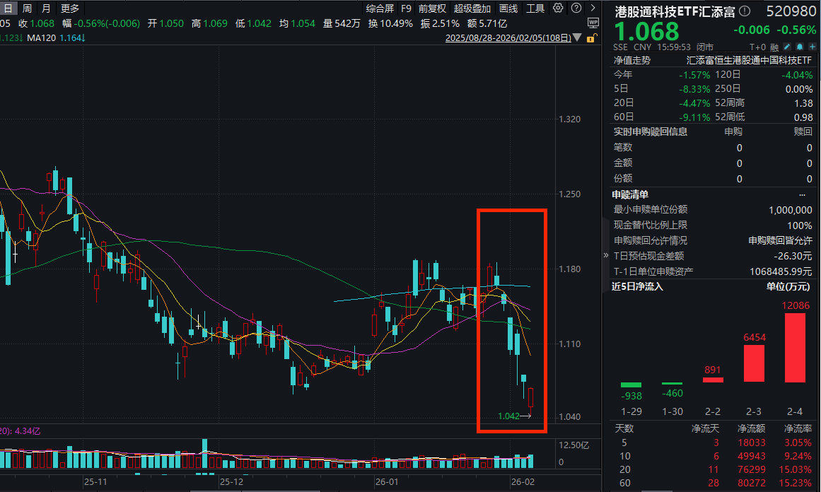 100%纯度的港股通科技ETF汇添富(520980)收跌0.56%,连续第6日回调,盘中再度刷新阶段新低。资金已连续3天净流入,累计“吸金”超1.9亿元! 今日同样全天溢价高企,或显示资金逢跌积极加仓意愿!