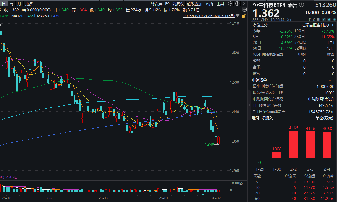 同类唯一15BP最低档管理费的恒生科技ETF汇添富(513260)震荡收平,盘中刷新阶段新低,全天成交额超3.7亿元!资金面上,恒生科技ETF汇添富(513260)近4日“吸金”超1.3亿元!最新融资余额攀升至超1.4亿元,基金最新规模超71亿元!值得注意的是,港股尾盘发力,恒生科技指数收涨0.74%,恒生科技指数成份股百度集团-SW大涨2.7%!