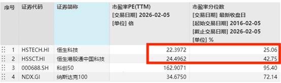 连续回调后,港股科技板块与同期A股和海外科技相比,估值性价比均较高。截至2月5日,恒生科技指数最新市盈率为22.4倍,处于近10年以来25.06%的历史分位;恒生港股通中国科技指数最新市盈率为24.5倍,处于近10年以来42.75%的历史分位。