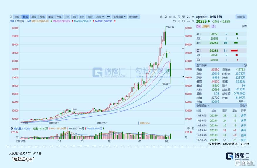 就在今天盘中,国际白银价格再度一度暴跌超12%,国内白银期货主力合约更是盘中大跌近20%,当天收跌10.85%,价格最低跌至18500元/千克,显著掉出周二“史诗级暴跌”时的最低价。