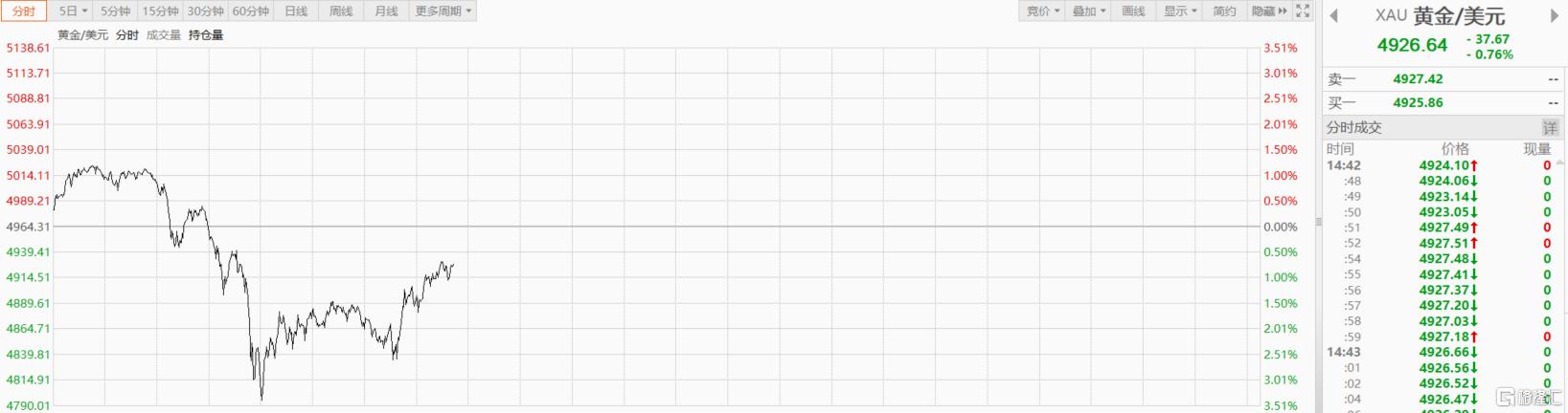 现货黄金盘中一度跌近3%,截至发稿收窄至下跌0.76%,报4926.64美元/盎司;