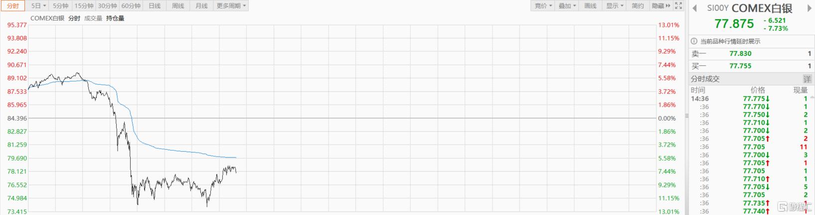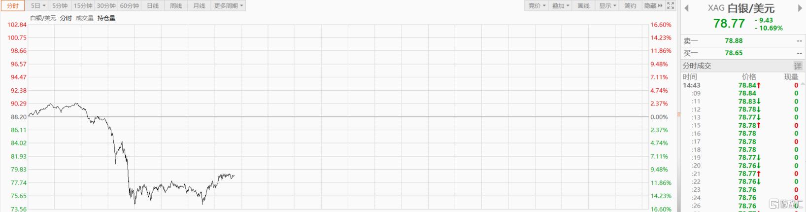 现货白银的跌势更为惨烈,盘中一度重挫近16%,截至发稿跌幅仍高达10.69%,报78.77美元/盎司。