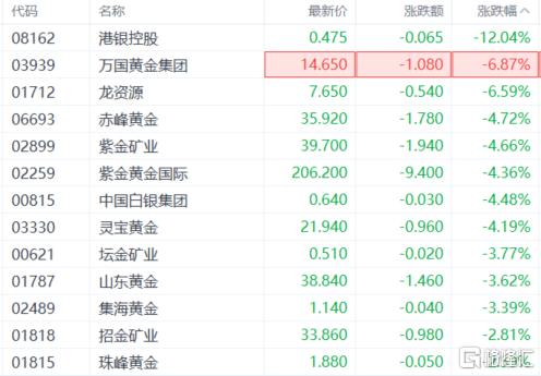 港股黄金及贵金属板块同步大跌,权重股紫金矿业、紫金黄金国际跌超4%。