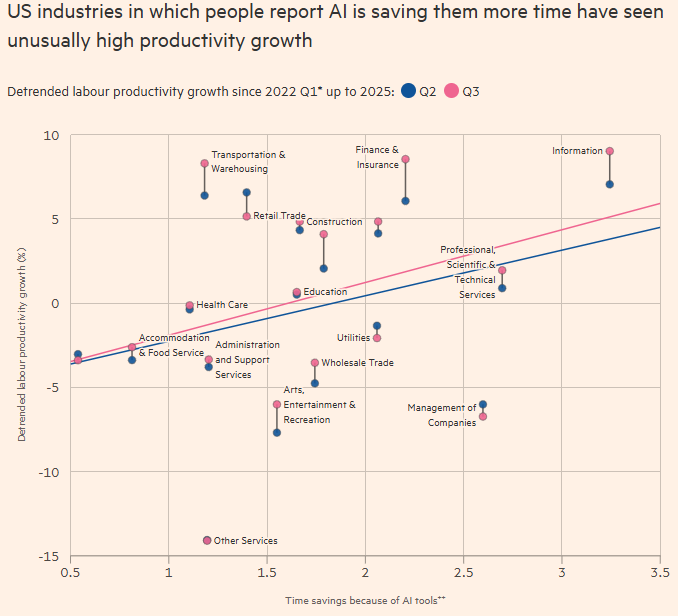 真正值得关注的是行业层面的相关性。如果AI确实能帮助企业提升人均产出,那么那些最积极采用AI的行业,应当展现出最强的劳动生产率增长。数据显示,在美国,这种相关性已经开始显现。