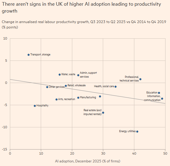一个信号出现在英国和美国令人振奋的劳动生产率增长数据上。当然,我对“振奋”的门槛不高。但更重要的是,这一增长背后可能存在比AI推动更容易解释的原因。