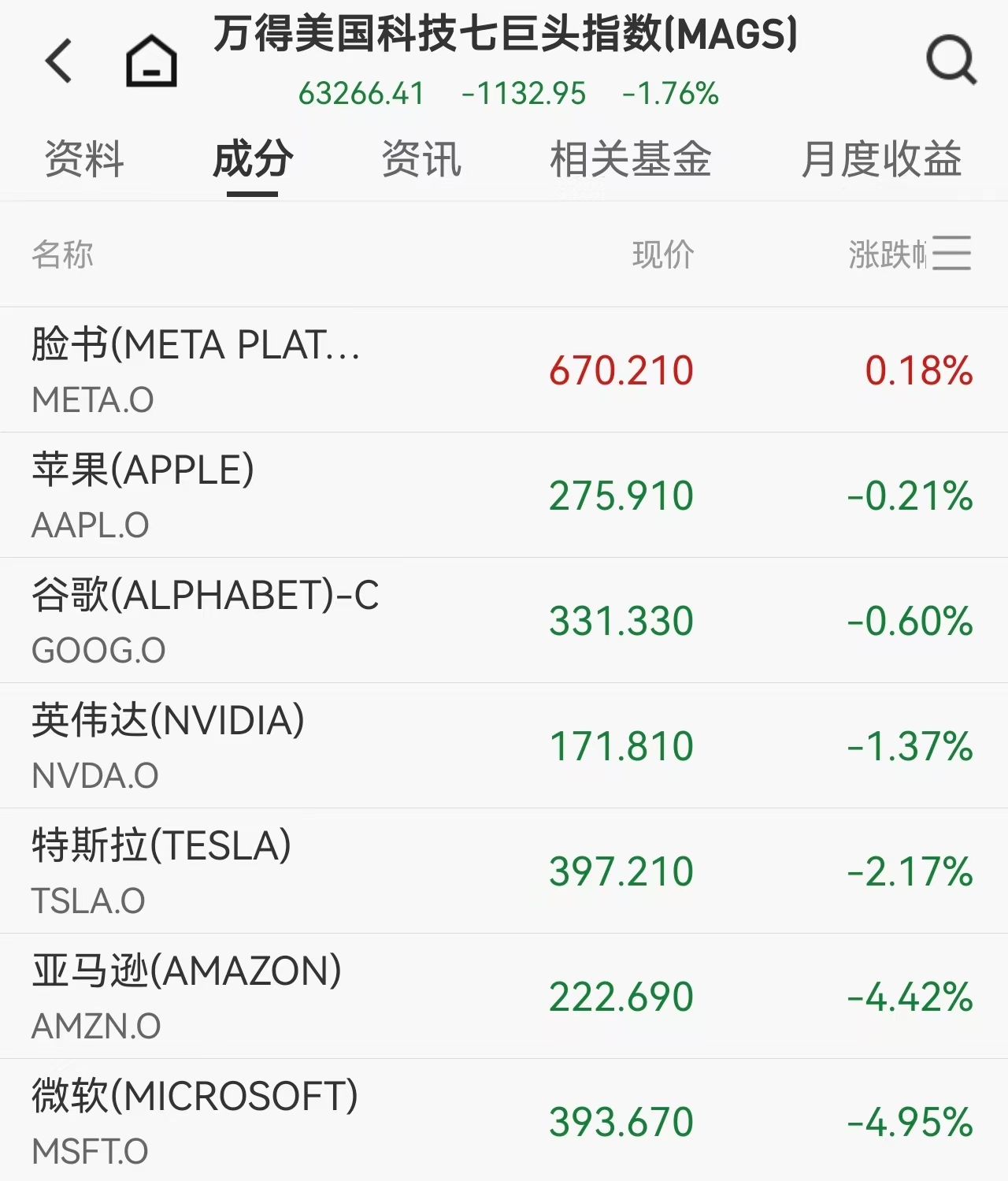 科技股成为此次下跌的重灾区,万得美国科技七巨头指数下跌1.76%。微软重挫4.95%,亚马逊跌超4.42%,特斯拉跌2.17%,英伟达跌1.37%,谷歌、苹果分别下跌0.6%和0.21%,仅Meta小幅上涨0.18%。