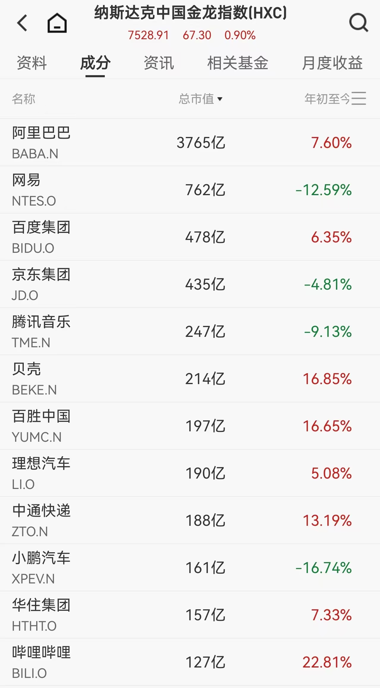 与美股市场的低迷形成鲜明对比的是中概股的逆势表现,纳斯达克中国金龙指数收涨0.9%,报7528.91点。个股方面,蔚来涨超6%领跑,其公告预计首次录得单季度经调整经营利润;亚朵、华住集团涨超5%,百胜中国、文远知行、唯品会涨超3%,美团-ADR、小米集团-ADR、比亚迪股份-ADR涨超2%,百度集团涨0.73%。