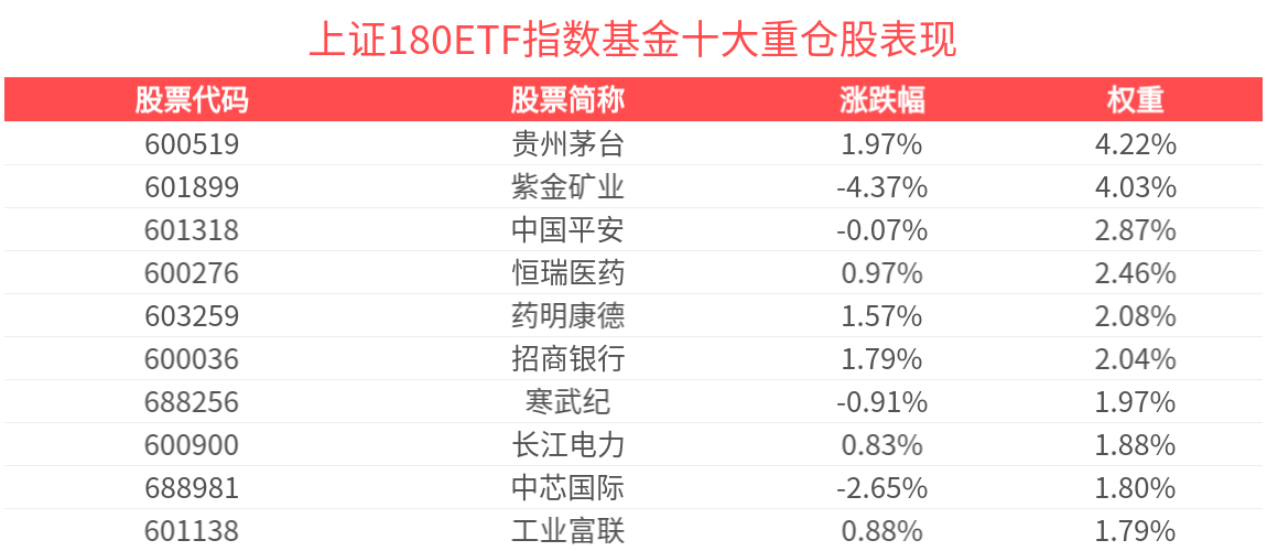 数据显示,截至2026年1月30日,上证180指数(000010)前十大权重股分别为紫金矿业、贵州茅台、中国平安、恒瑞医药、药明康德、寒武纪、招商银行、长江电力、中芯国际、海光信息,前十大权重股合计占比24.85%。(以上所列股票仅为指数成份股,无特定推荐之意)