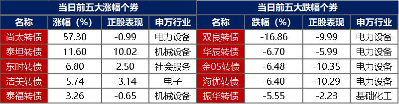 【转债市场主要指数集体跟跌】 2月5日,转债跟随权益市场有所下行,中证转债、上证转债、深证转债分别收跌0.84%、0.95%、0.66%。转债市场成交额740.66亿元,较前一交易日缩量132.66亿元。转债市场个券多数下跌,383支转债中,90支收涨,279支下跌,14支持平。当日上涨个券中,新上市尚太转债涨停57.3%,存量个券中泰坦转债涨超11%;下跌个券中,双良转债跌逾16%,华辰转债、金05转债、海优转债跌逾6%。