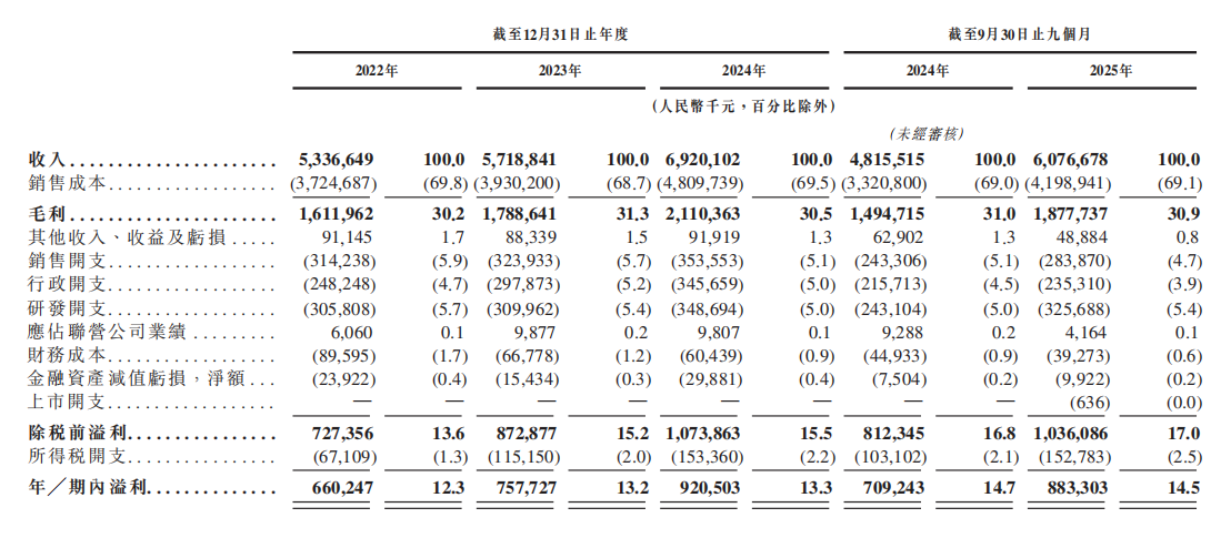 收入与利润稳健攀升:公司收入从2022年的53.37亿元持续增长至2024年的69.20亿元,2025年前九个月已达60.77亿元。同期,净利润从6.60亿元增长至9.21亿元,2025年前九个月为8.83亿元,净利率稳定在13-14%的较高水平,显示出良好的盈利能力和成本控制。