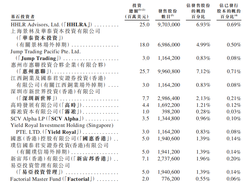 本次发行基石投资者阵容强大,成功引入16名基石投资者,包括高瓴集团旗下HHLR、上海景林资产、Jump Trading、江西铜业、新宙邦等知名产业及财务投资机构,合计认购4,822.88万股,约占全球发售股份的34.45%。顶级产业资本的参与,彰显了对其行业地位及发展前景的深度认可。
