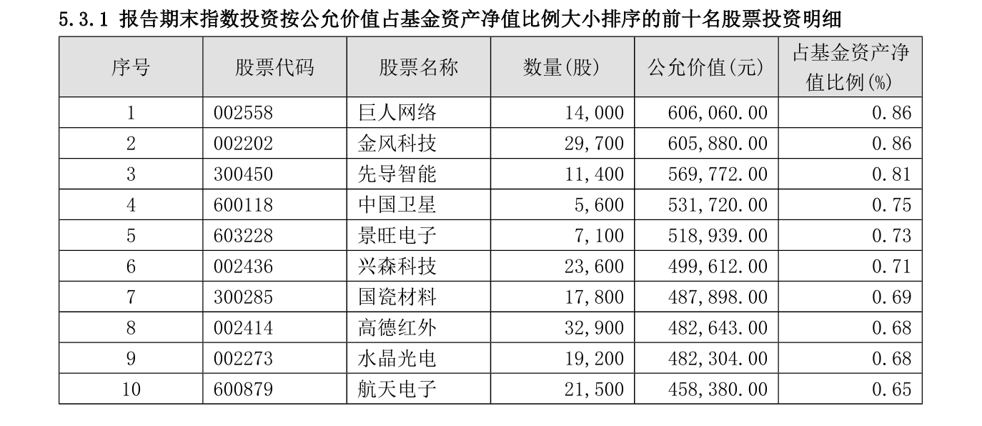 基金前十大重仓股均为中证500指数成分股,合计占基金资产净值约7.24%,整体持股分散。 从行业分布看,覆盖信息技术(如巨人网络、水晶光电)、高端制造(先导智能、金风科技)、航空航天(中国卫星、航天电子)及电子(景旺电子、兴森科技)等多个成长领域。积极投资部分前五名股票依次为新光光电、拉卡拉,盛路通信、中信证券、华鑫股份,合计占净值约1.55%,进一步体现了基金通过量化模型在控制整体风格暴露基础上进行的增强布局。