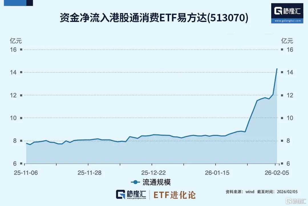 从资金面看,港股通消费ETF易方达(513070)近10日资金净流入5.04亿元,最新规模14.34亿元,在同类产品中居首。该ETF支持T 0交易,综合费率为0.2%,为全市场港股消费类ETF中的最低水平。