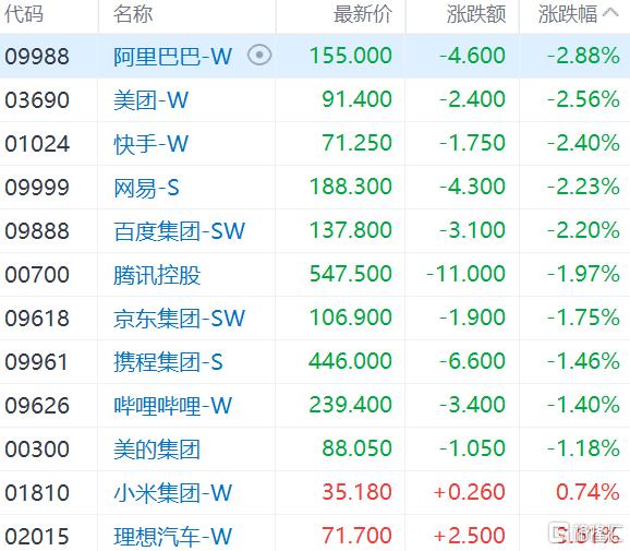 大型科技股多数下跌,阿里巴巴、美团、快手、网易、百度跌超2%,腾讯、京东、携程、哔哩哔哩、美的跌超1%;另一方面,理想汽车涨超3%,小米集团涨不足1%。