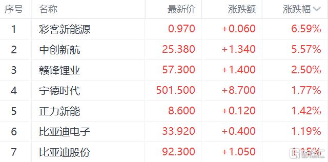 锂电池板块走高,彩客新能源涨超6%,中创新航涨超5%,赣锋锂业涨超2%。