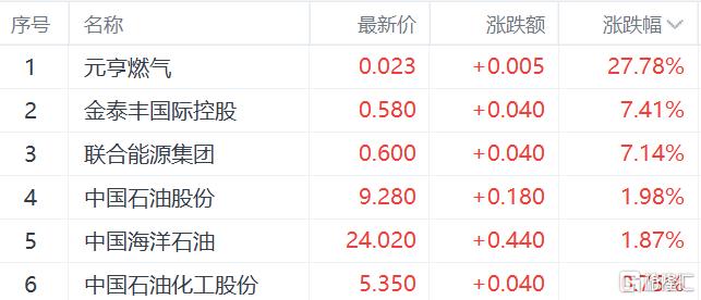 石油天然气板块上涨,元亨燃气涨超27%,金泰丰国际控股、联合能源集团涨超7%。