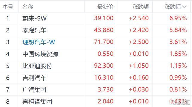汽车板块继续上升,蔚来涨近7%,零跑汽车涨超5%,理想汽车涨超3%,比亚迪股份涨超1%。