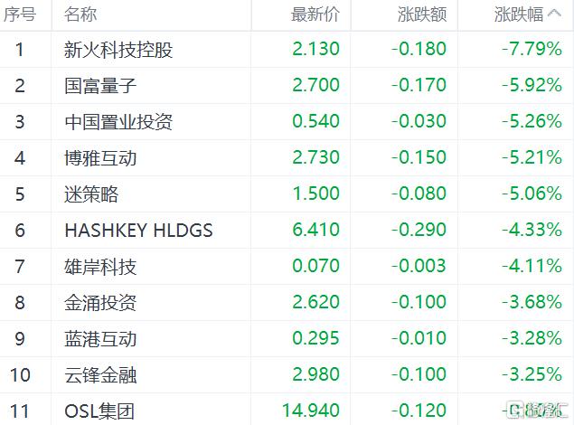 加密货币概念大跌,新火科技控股跌超7%,国富量子跌近6%,中国置业投资、博雅互动等跌超5%。