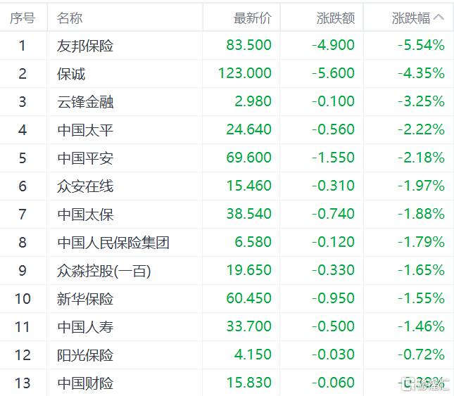 保险板块走低,友邦保险跌超5%,保诚跌超4%,云锋金融跌超3%,中国太平跌超2%。