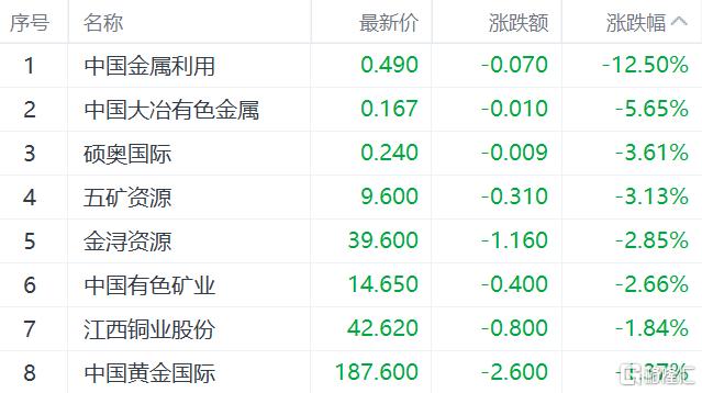 铜业股下跌,中国金属利用跌超12%,中国大治有色金属跌超5%,硕奥国际、五矿资源跌超3%。