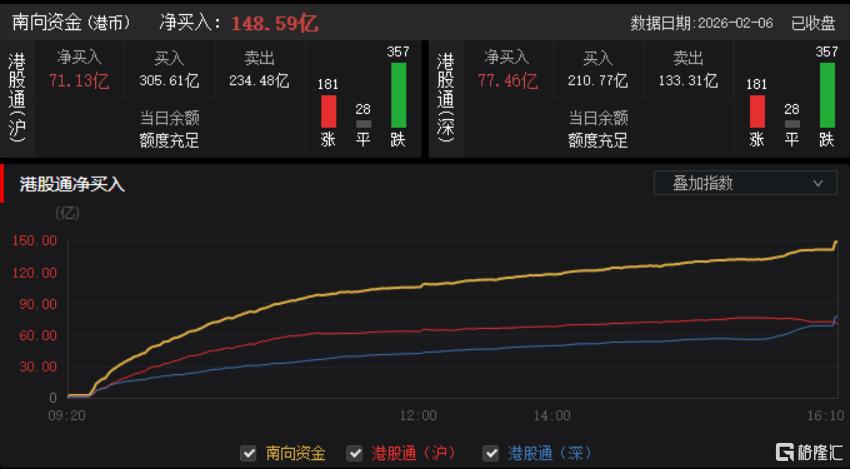 今日,南向资金净买入148.59亿港元,其中港股通(沪)净买入71.13亿港元,港股通(深)净买入77.46亿港元。