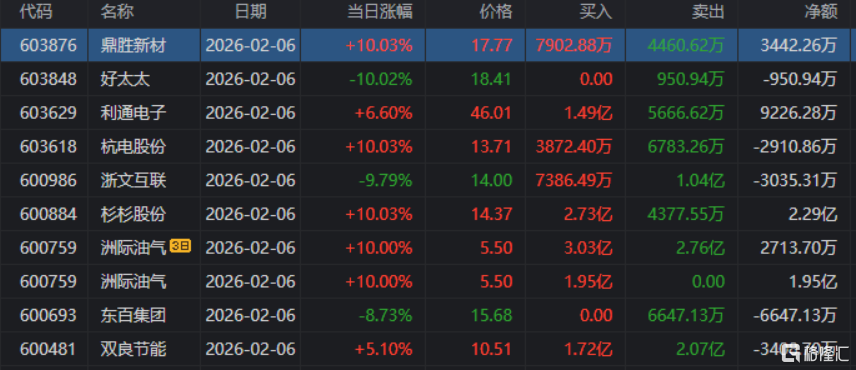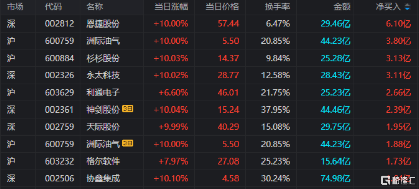 龙虎榜单日净买入额前三为恩捷股份、洲际油气、杉杉股份,分别为6.1亿元、3.8亿元、3.13亿元。