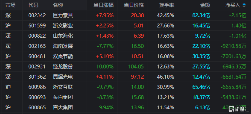 龙虎榜单日净卖出额前三为巨力索具、浙文影业、山东海化,分别为2.15亿元、1.4亿元、1.01亿元。