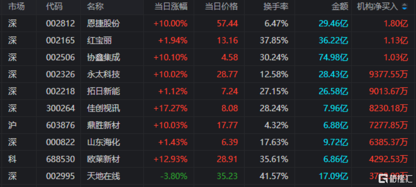 龙虎榜中涉及机构专用席位的个股中,当日净买入额前三为恩捷股份、红宝丽、协鑫集成,分别为1.8亿元、1.13亿元、1.03亿元。