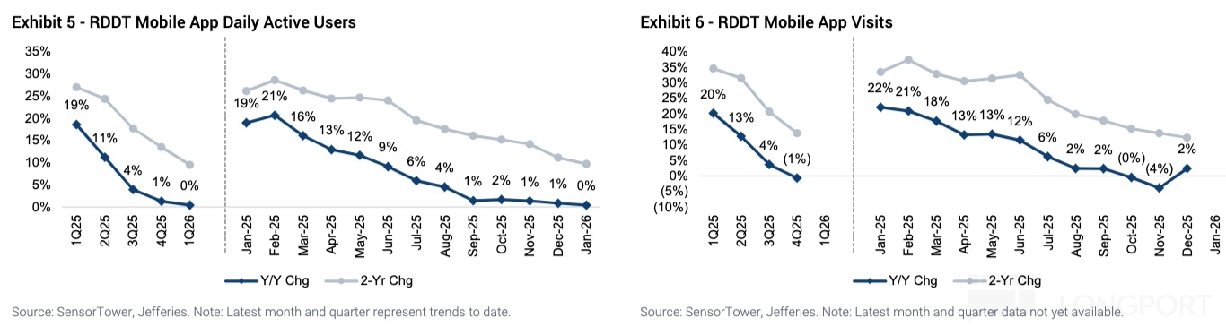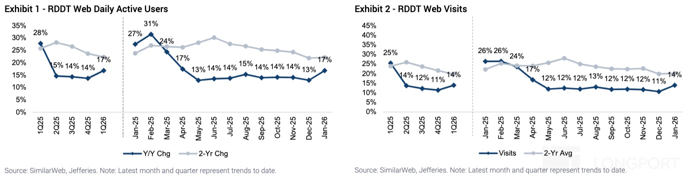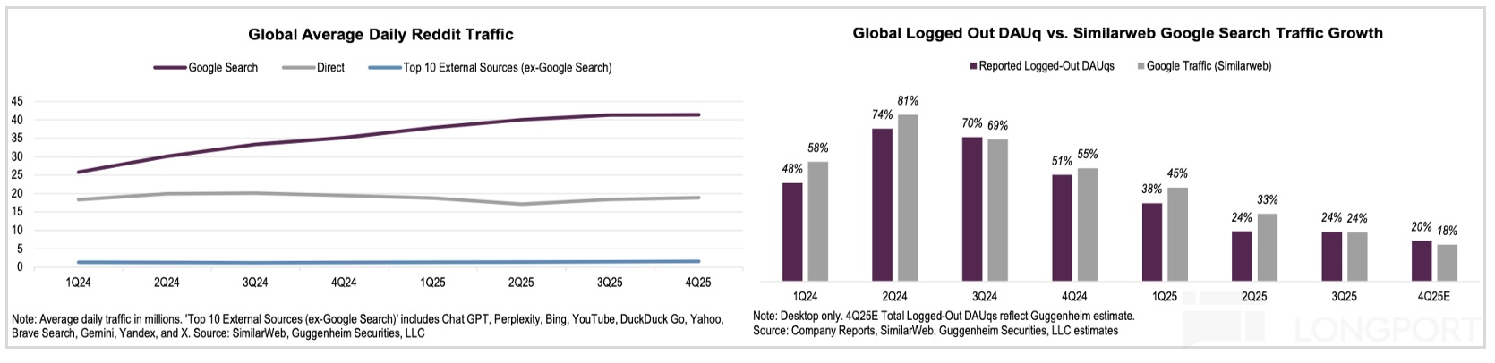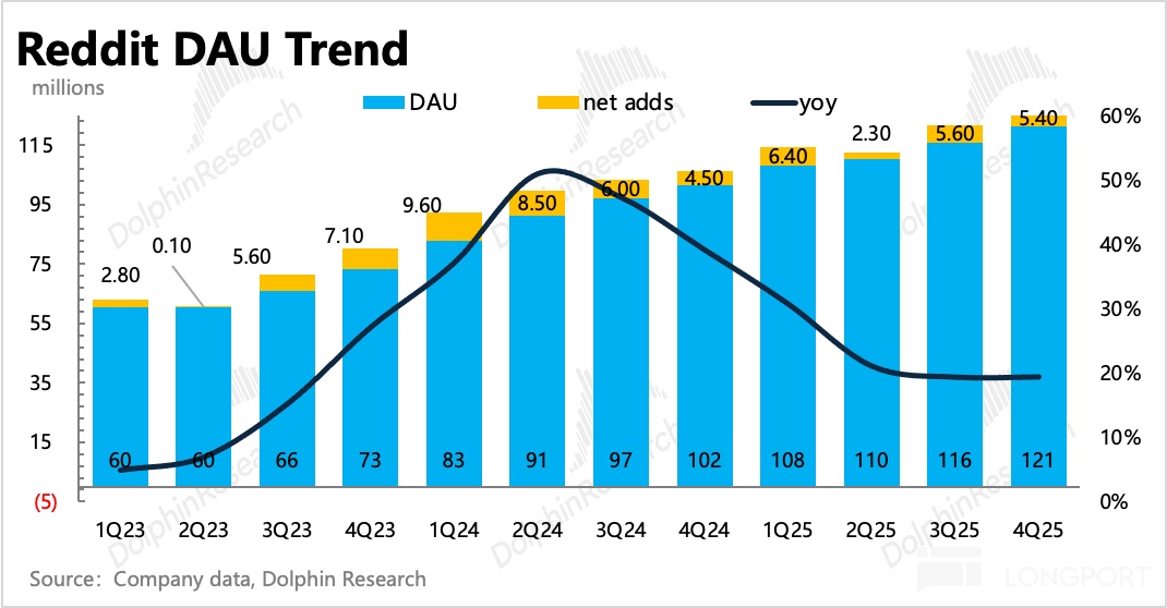 由此说明,Reddit 仍然在吃 Google 的导流红利。并且在其他外部来源增量已经不明显的情况下,Google 给的流量就愈发宝贵。有机构将 Reddt 财报披露的 DAU 增速与 Google 导流增速对比,发现变化趋势基本一样。
