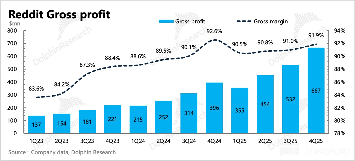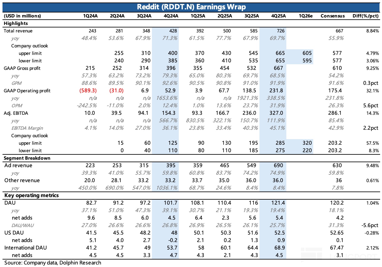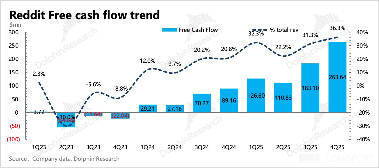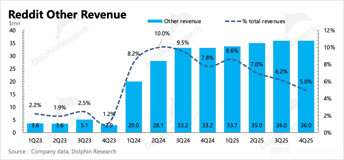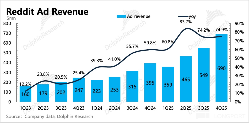 1、变现继续加深:Q4 总收入 7.3 亿,同比增长 70%,环比还略有加速,而去年同期的基数实际并不低。其中增长靠广告,数据授权收入在合同内按时间确认,因此基本稳定(主要客户就是 Google 和 OpenAI 以及 Perplexity 等 AI 厂商用于训练模型)。今年底 Google 和 OpenAI 的三年合同到期,大概率会续签。