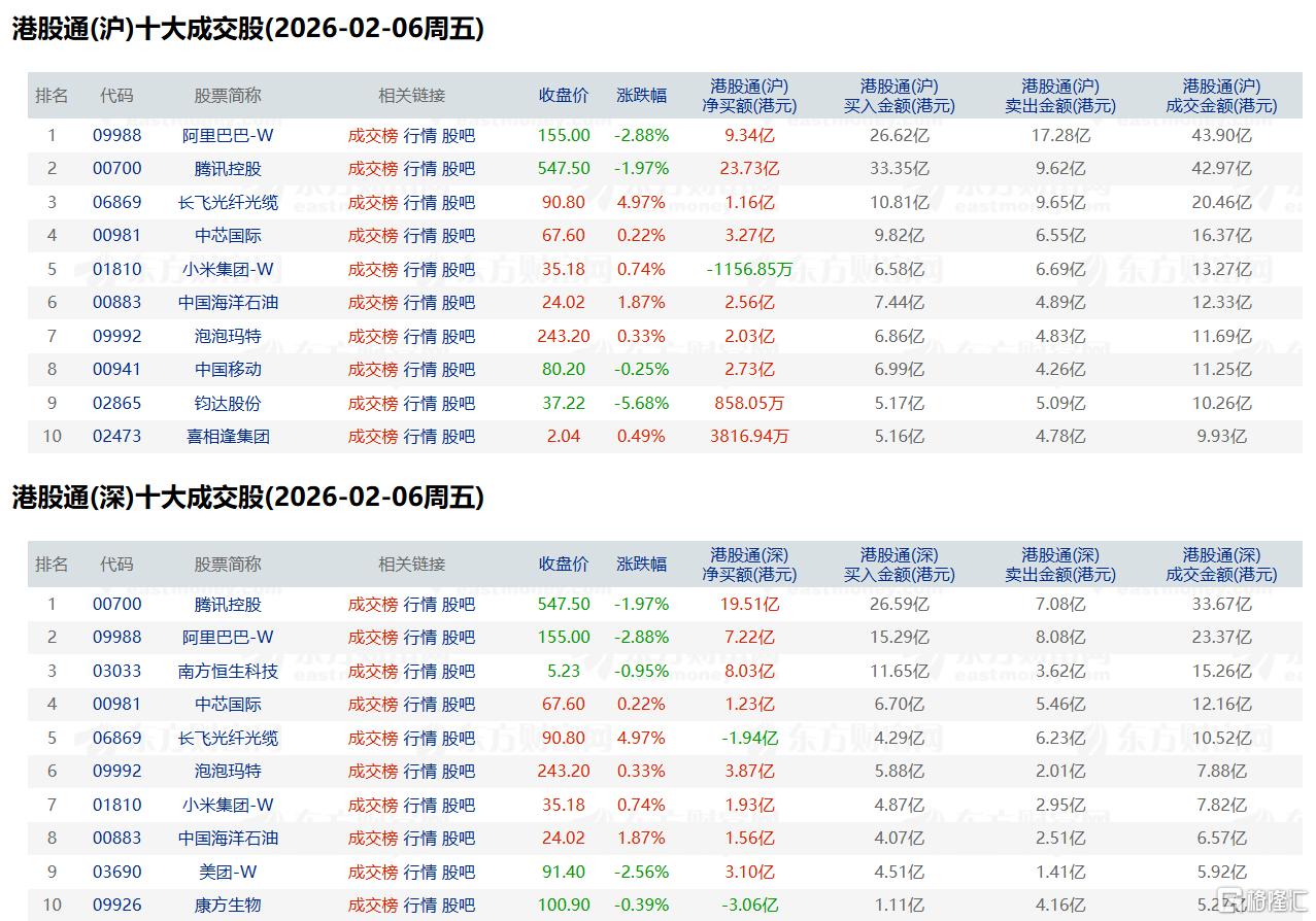 其中,腾讯控股、阿里巴巴分别获净买入43.24亿港元、16.56亿港元;康方生物、长飞光纤光缆分别净卖出3.06亿港元、0.79亿港元。
