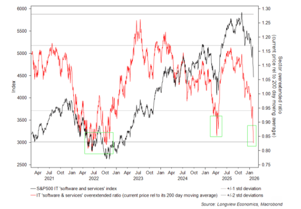 他的观点与Longview Economics首席市场策略师克里斯·沃特林的判断一致。沃特林表示,根据他的“超限指标”,“软件与服务”行业目前处于过去十年来最超卖的水平之一。