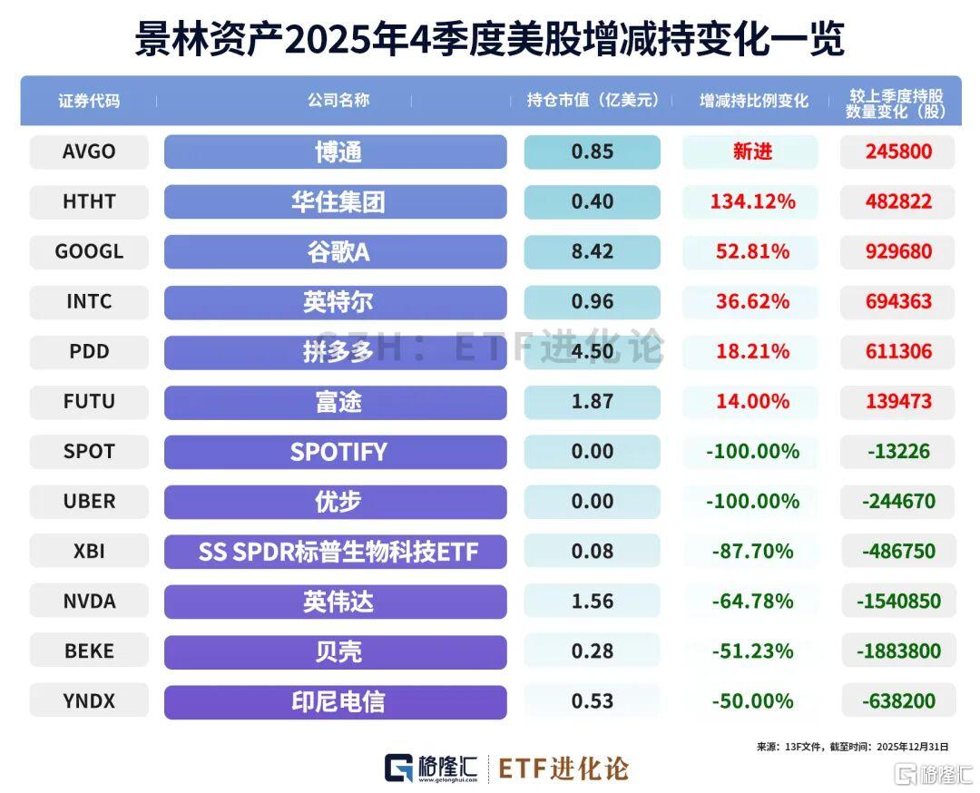 同时,景林四季度还新进博通24.58万股、翻倍买入华住集团,加仓英特尔、拼多多和富途。