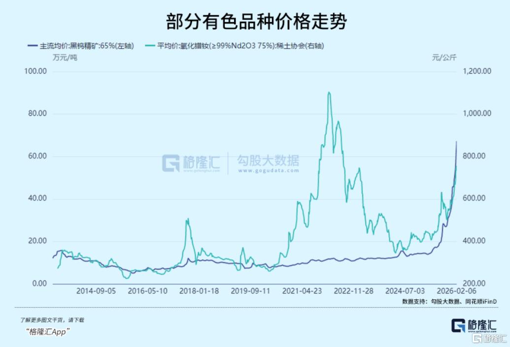 在板块整体震荡调整期,仍有多个细分品种逆势上涨,凸显供需紧平衡的核心支撑:近两周,氧化镨钕上涨12.64%至 75.75 万元/吨,黑钨精矿价格上涨约 25%至 67.3万元/吨。