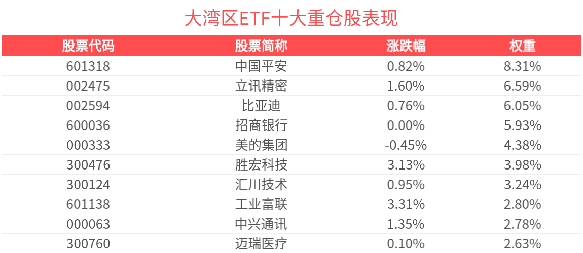 数据显示,截至2026年1月30日,中证粤港澳大湾区发展主题指数(931000)前十大权重股分别为中国平安、立讯精密、比亚迪、招商银行、美的集团、胜宏科技、汇川技术、中兴通讯、迈瑞医疗、工业富联,前十大权重股合计占比44.55%。(以上所列股票仅为指数成份股,无特定推荐之意)